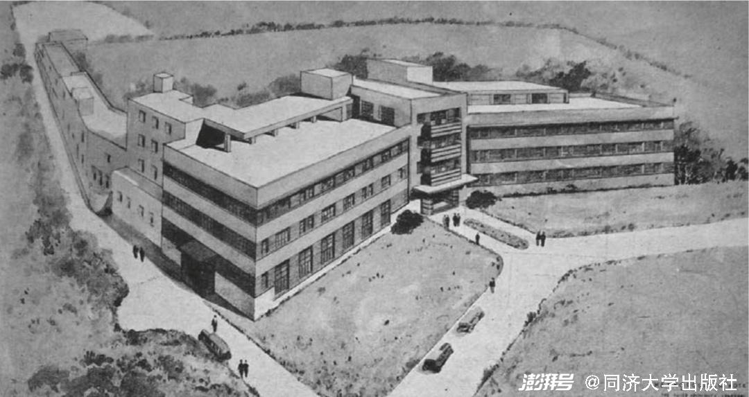 从首层平面图来看,主体平面呈折线形,“建筑的每一条边线都与邻近的基地边线平行,复杂的基地形状产生了一个复杂的建筑轮廓,产生了一种自由的现代感”。一层的锅炉房和餐室凸出于主体,西北端的活动室与主体的交接也显暧昧,童寯重复了1931年赵深设计铁道部购料委员会时的做法,即辅助功能与建筑主要功能体量在平立面上的双重脱离。辅助功能单层化、洞口宽度标准化、与主体建筑以室内通道相连,建筑表面仅“粉水泥打毛”。