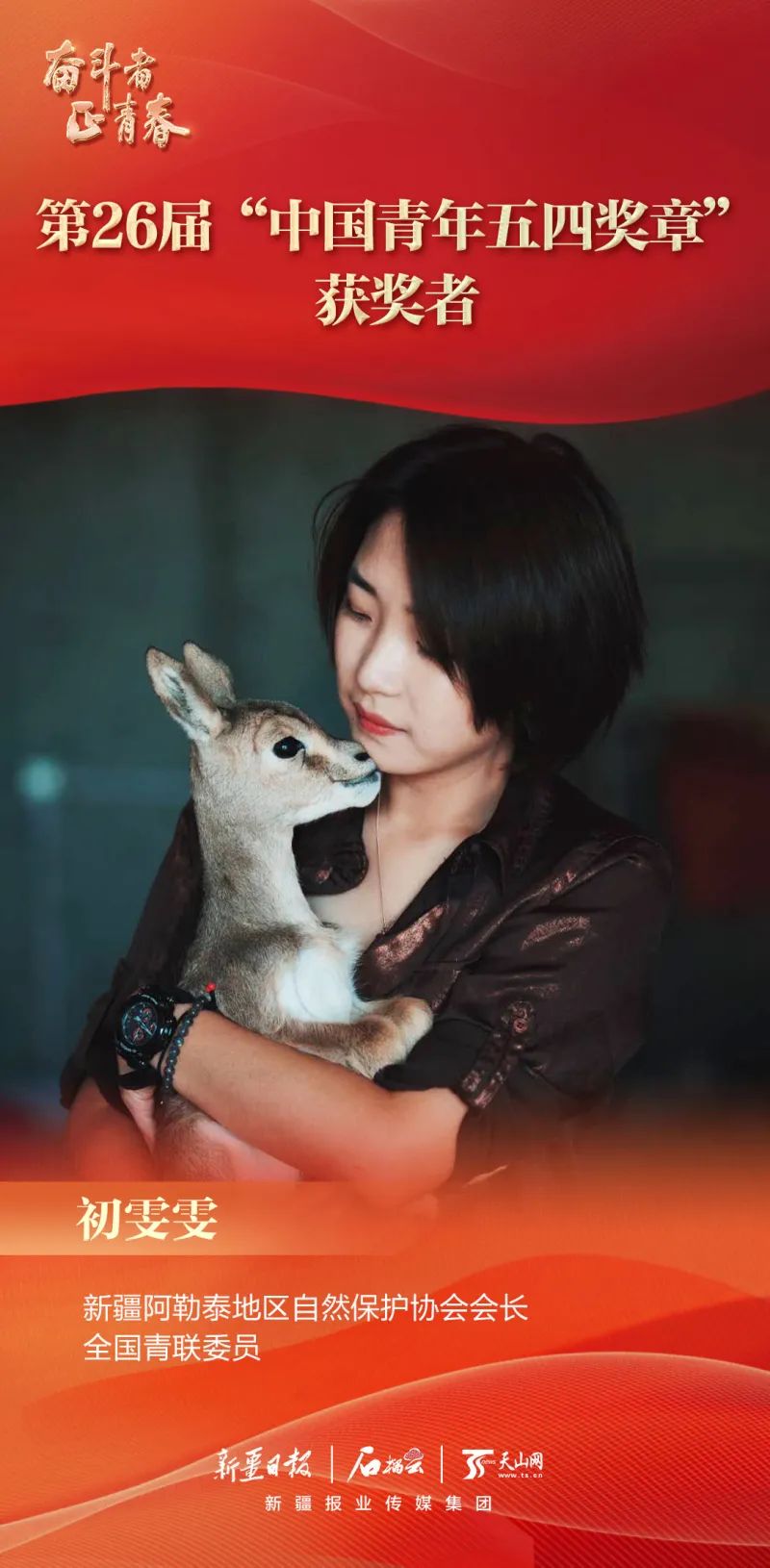 在五四青年节来临之际,共青团中央、全国青联共同颁授第26届“中国青年五四奖章”,新疆1集体1个人获得表彰,分别是:和田县塔瓦库勒乡巴克墩村小学西部计划志愿者接力支教服务队,阿勒泰地区自然保护协会会长、全国青联委员初雯雯。