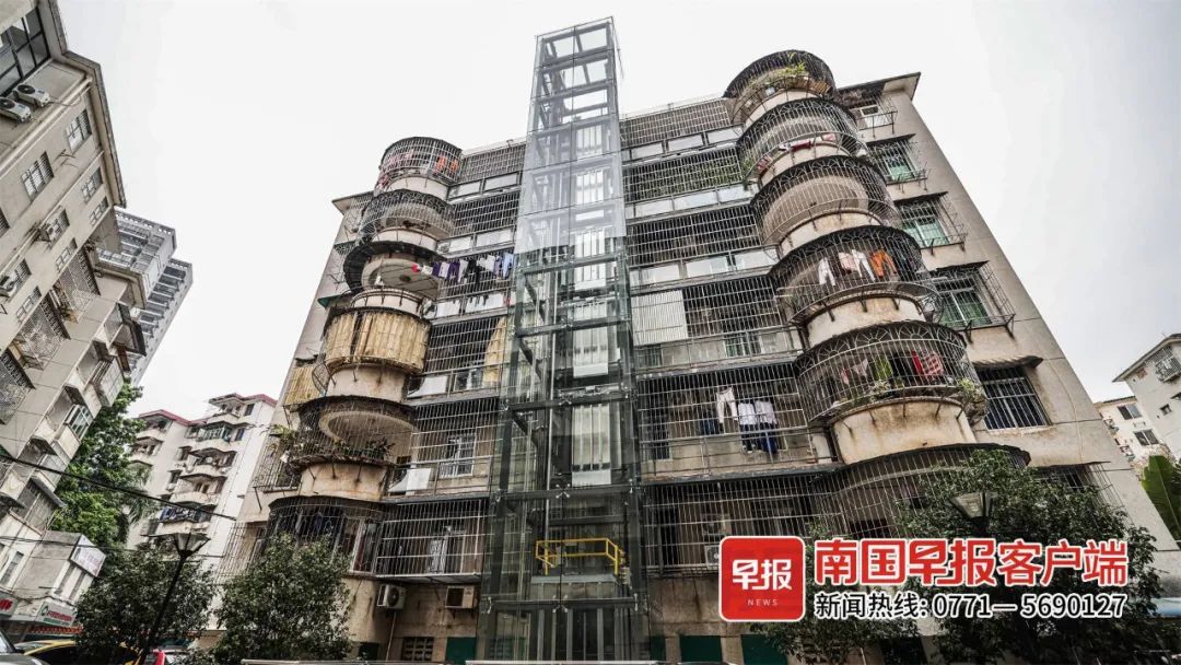 ▲南宁市植物路一老旧小区加装了玻璃外墙的电梯。