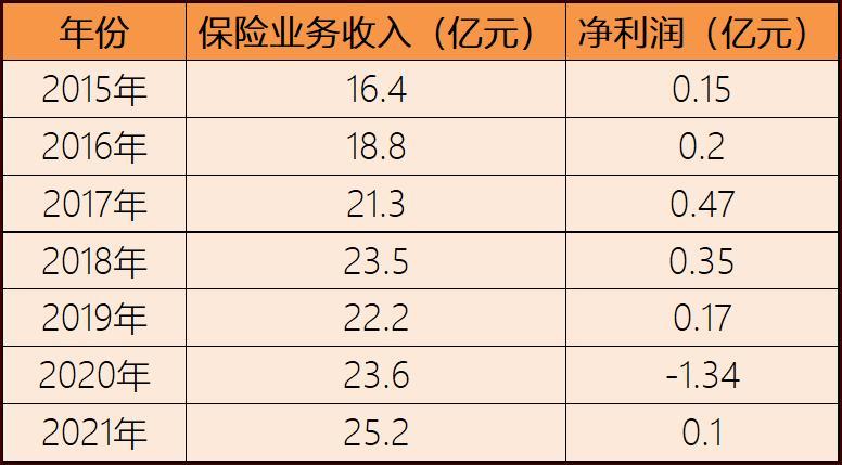 2011年至2021年,该公司分别实现保险业务收入0.46亿元、3.86亿元、8.61亿元、11.14亿元、12.77亿元、13.82亿元、15.51亿元、17.39亿元、22.71亿元、23.75亿元、25.05亿元,净利润分别为0.23亿元、-0.96亿元、-1.08亿元、-0.38亿元、0.21亿元、0.23亿元、0.26亿元、0.06亿元、0.095亿元、0.16亿元、-0.99亿元。
