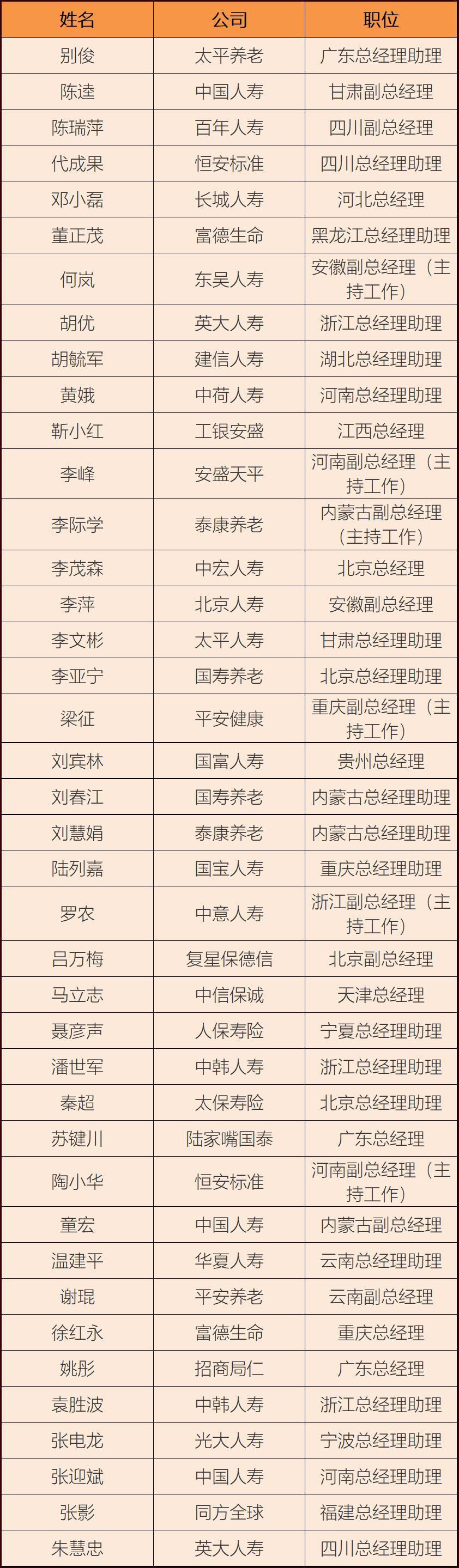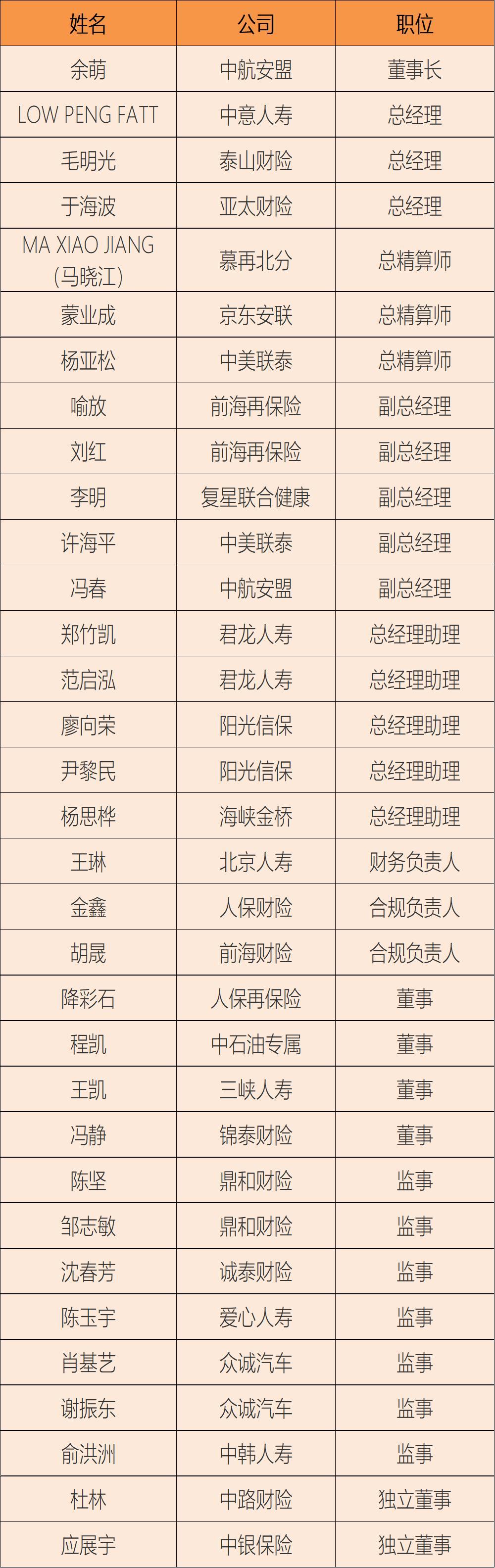 其中,中航安盟同时变更董事长和副总经理,中意人寿、泰山保险、亚太财险三家公司总经理履新,慕再北京分公司、京东安联、中美联泰迎来新一任总精算师。