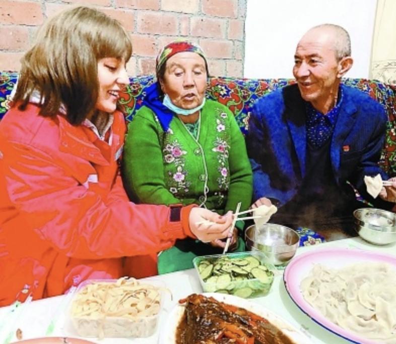 麦吾丽旦·沙拉木(左一)和村民边吃饭边拉家常,了解村民所困所难。