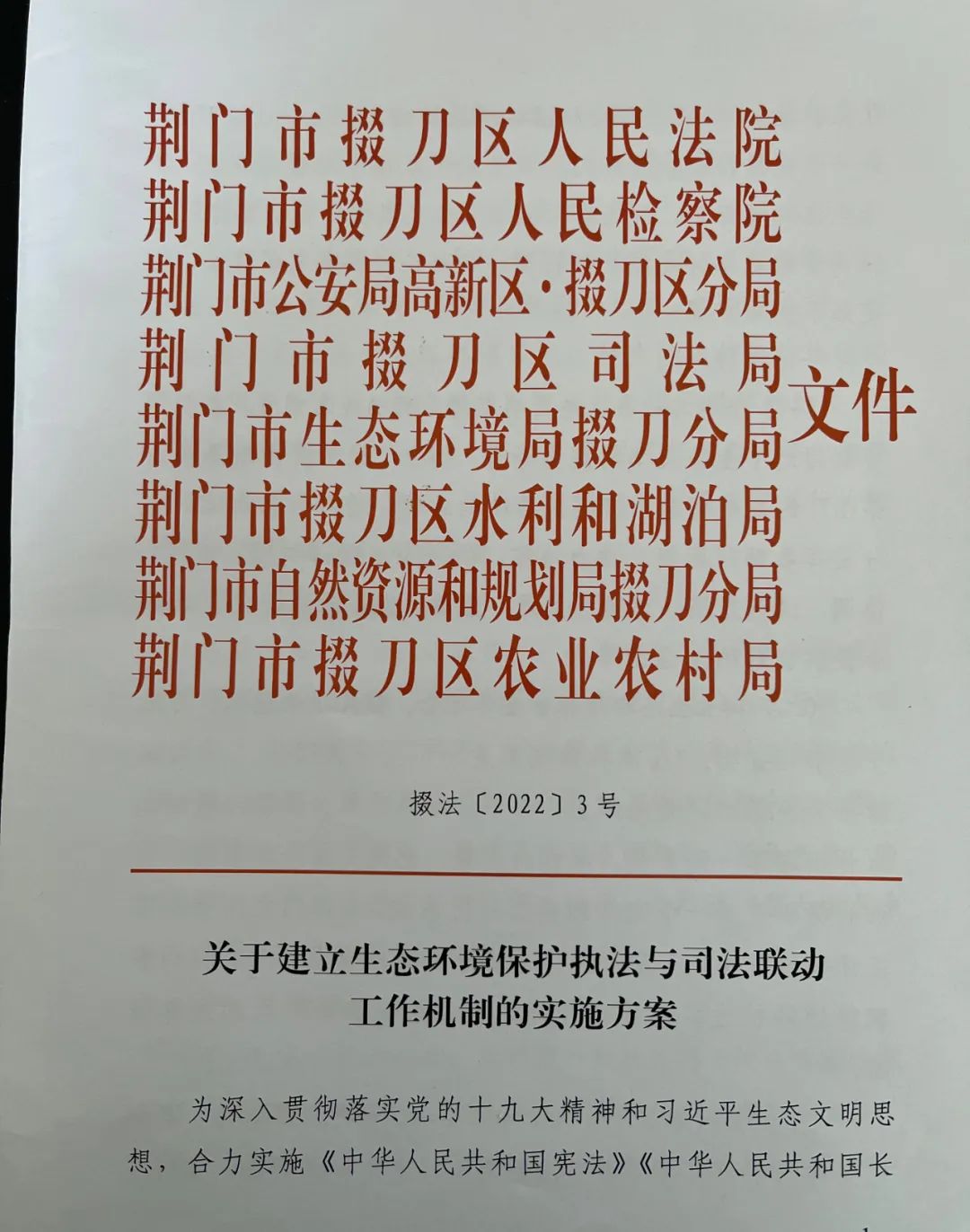 为进一步推进行政执法部门和司法机关积极主动履行职责,加强生态环境保护,推进生态文明建设,掇刀区法院联合区检察院、荆门市公安局高新区·掇刀区分局、区司法局、荆门市生态环境局掇刀分局、区水利和湖泊局、荆门市自然资源和规划局掇刀分局、区农业农村局共同制定《关于建立生态环境保护执法与司法联动工作机制的实施方案》。