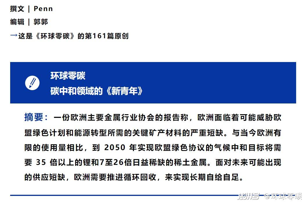 但是,最近欧洲金属生产商协会(Eurometaux )委托比利时鲁汶大学的一项研究发现,与当今欧洲有限的使用量相比,实现欧盟绿色协议提到的到 2050 年实现气候中和的目标,将需要35倍以上的锂和7至26倍的稀土金属。