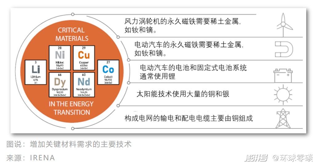 随着清洁能源技术在未来几十年的部署,作为可再生能源发电和能源系统电气化的一部分,对关键材料的需求预计将迅速增长。清洁能源技术,比如太阳能光伏和聚光太阳能技术的实现依赖锗、碲、铟、镓、锰等元素作为能源转化的关键超导材料;风力发电机依赖钕、镝、镨等稀土元素作为磁性原料;新能源汽车和燃料电池均依赖镍、钴、锂等作为电极材料,燃料电池还依赖铂作为储能材料。