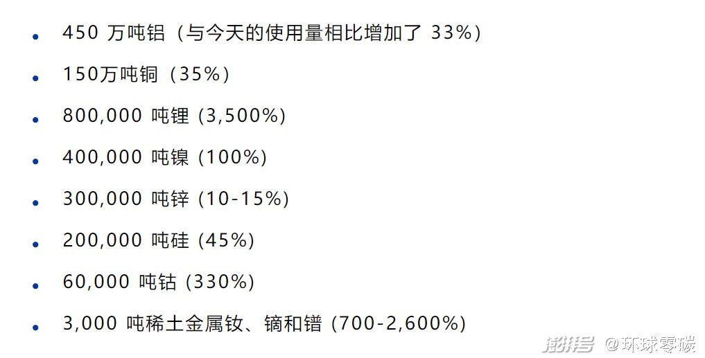 从欧洲看,根据鲁汶大学的研究,欧洲的能源转型和实现2050 年气候中和目标,除了需要35倍以上的锂和7至26倍的稀土金属,还需要比该地区今天使用的锌的年供应量增加 10% 至 15%、铝增加 30%、铜增加35%、硅增加45%、镍增加100% 和钴增加330%——所有这些资源都是电动汽车和电池、风能、太阳能和氢能技术、电网基础设施生产的必要金属。