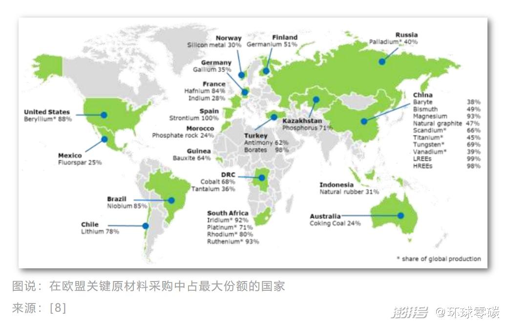 事实上,欧盟仍然依赖从俄罗斯、中国和印度尼西亚进口所需的清洁能源金属,其中,铝、镍和铜供应依赖俄罗斯,电池金属和稀土金属则依赖印度尼西亚和中国。而其他几个国家在欧盟特定关键原材料的供应中也占主要份额,如巴西(铌)、智利(锂)和墨西哥(萤石)。