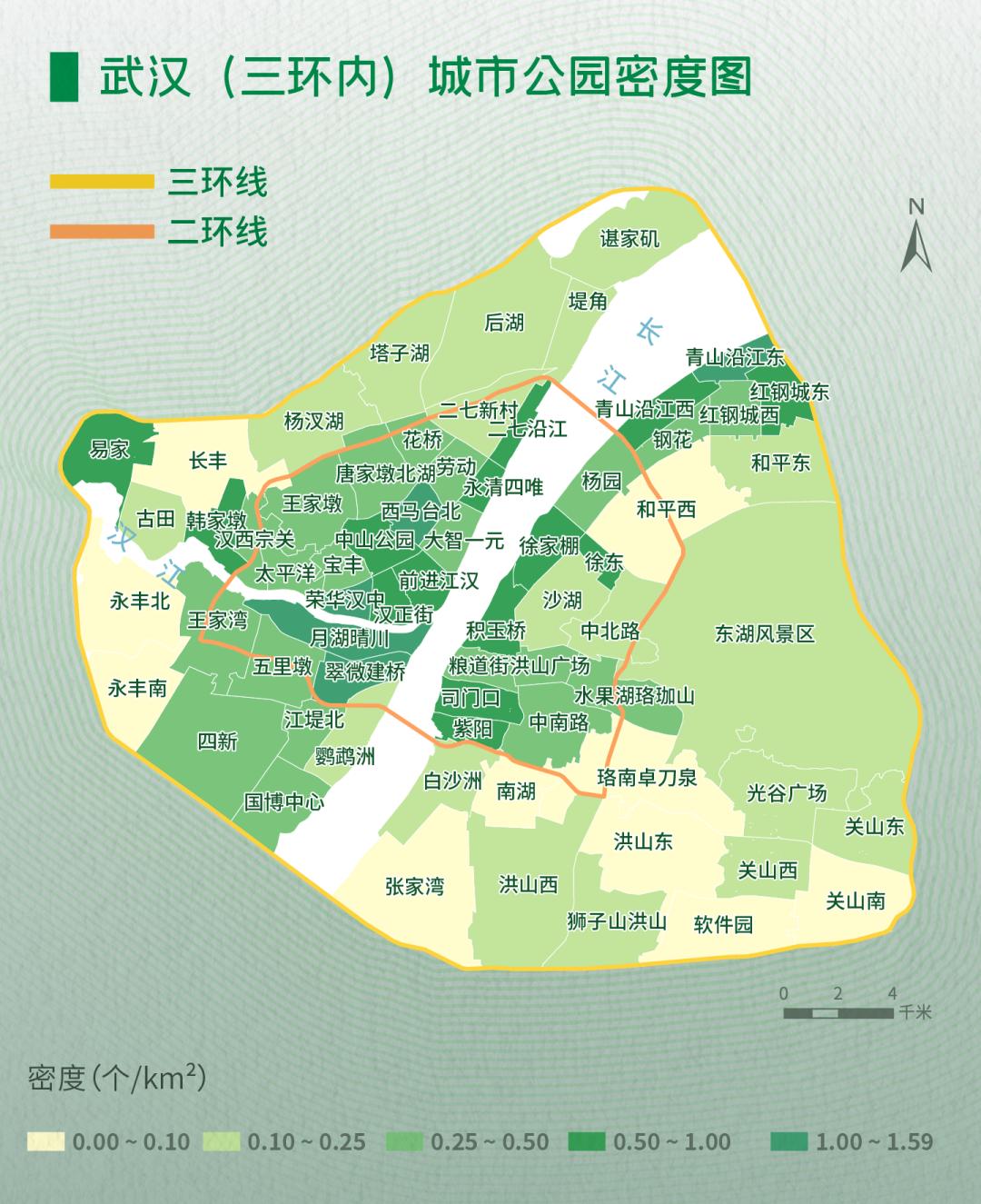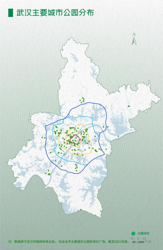 武汉有82个(约占整体公园60%)城市公园集中在三环内,以南岸嘴为中心,从密到疏向城市边缘扩散。