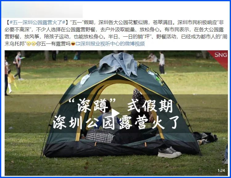 五一复工第一天,打开微博,同城榜热搜上赫然挂着#五一深圳公园露营火了#的话题。