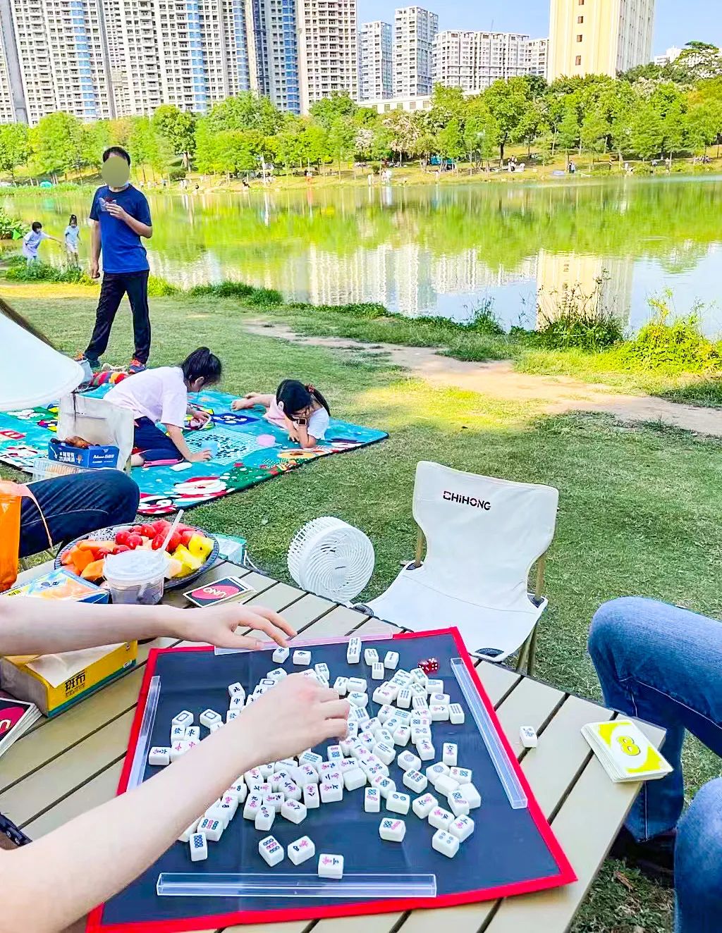 3号下午,莎莎和朋友们开车直奔福田中心公园,在河边搭起帐篷玩游戏吃下午茶。