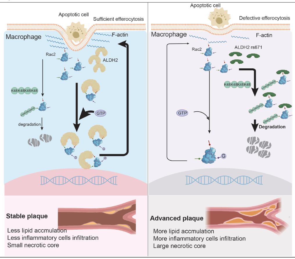 本研究通过骨髓移植等方法构建髓系细胞ALDH2特异性敲除小鼠,并通过高通量mRNA测序与生物信息学分析等研究手段,结合大量体内体外实验发现,ALDH2野生型基因表达的蛋白可通过直接与Rac2蛋白结合,抑制Rac2蛋白K123位点上K48连接形式的多聚泛素化修饰,从而抑制Rac2降解,增强Rac2稳定性,进而增强巨噬细胞胞葬作用,抑制动脉粥样硬化发生发展;然而,rs671变异基因所表达的蛋白则丧失了这一保护功能,从而促进了ACS的发生。本研究成果为ACS的精准防治提供了新的靶点,对携带rs671变异的30%-50%的国人群体降低ACS发病风险的意义尤为重大。本研究还进一步丰富了ALDH2的非酶活性作用谱,完善了ALDH2在不同急危重心血管疾病中的“双刃剑”作用理论,为未来开发基于ALDH2的组织特异性治疗提供了更多科学依据。ATVB杂志在线配发了欧洲血管生物学学会秘书长Judith C. Sluimer教授对本文的专题评述文章,称“该研究解决了动脉粥样硬化病理过程中坏死细胞清除机制的一个难题”,“考虑到东亚人ALDH2 rs671变异的广泛性,该研究有着深远的影响”。
