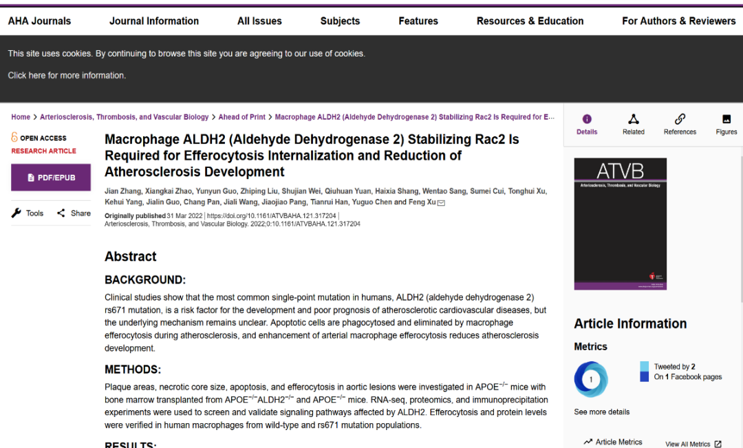 近日,山东大学齐鲁医院急诊科胸痛中心陈玉国、徐峰教授团队在美国心脏协会动脉硬化、血栓和血管生物学委员会官方期刊Arteriosclerosis, Thrombosis, and Vascular Biology(中科院1区,IF=8.313)在线发表题为“Macrophage ALDH2 stabilizing Rac2 is required for efferocytosis internalization and reduction of atherosclerosis development”[巨噬细胞中乙醛脱氢酶2(ALDH2)通过稳定Rac2促进胞葬作用并抑制动脉粥样硬化发展]的研究论文,揭示了ALDH2促进巨噬细胞胞葬进而抑制动脉粥样硬化发生发展的非酶作用新机制,为急性冠脉综合征(acute coronary syndrome,ACS)的药物研发提供了新的靶点,特别是对携带ALDH2基因rs671变异的30%-50%的国人群体降低ACS发病率意义重大。山东大学齐鲁医院为第一作者和通讯作者单位,徐峰教授为文章独立通讯作者,博士研究生张健和硕士研究生赵祥凯为共同第一作者。