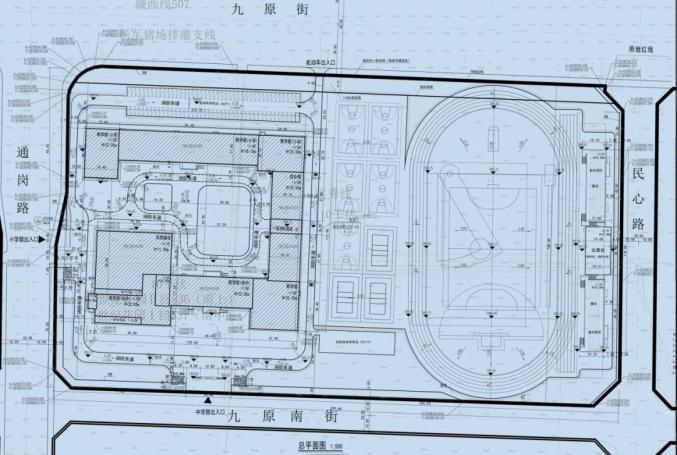 经济技术指标:总建设用地面积:60820.18㎡(约91.23亩);总建筑面积:32293.77㎡;地上总建筑面积:31882.33㎡;其中:教学楼、综合楼面积:28842.91㎡;风雨操场建筑面积:1652.78㎡;门卫建筑面积:71.64㎡;主席台、看台、室外厕所建筑面积:1315㎡;地下总建筑面积:411.44㎡;基底建筑面积:8733.19㎡;其中:教学楼基底面积:5469.11㎡;风雨操场基底面积:1652.94㎡。