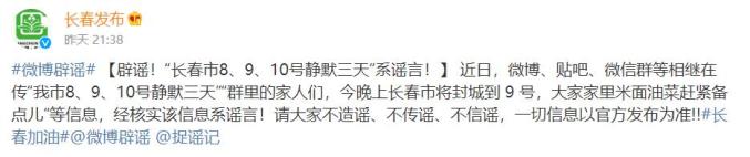 据@长春发布 5月6日晚消息,近日,微博、贴吧、微信群等相继在传“我市8、9、10号静默三天”“群里的家人们,今晚上长春市将封城到9号,大家家里米面油菜赶紧备点儿”等信息,经核实该信息系谣言!请大家不造谣、不传谣、不信谣,一切信息以官方发布为准!