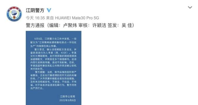 江苏省江阴市公安局5月6日发布警情通报称,5月5日,江阴警方在工作中发现,一段配文为“江阴南闸街道核酸检测点一孕妇在生产”的视频在网上传播。