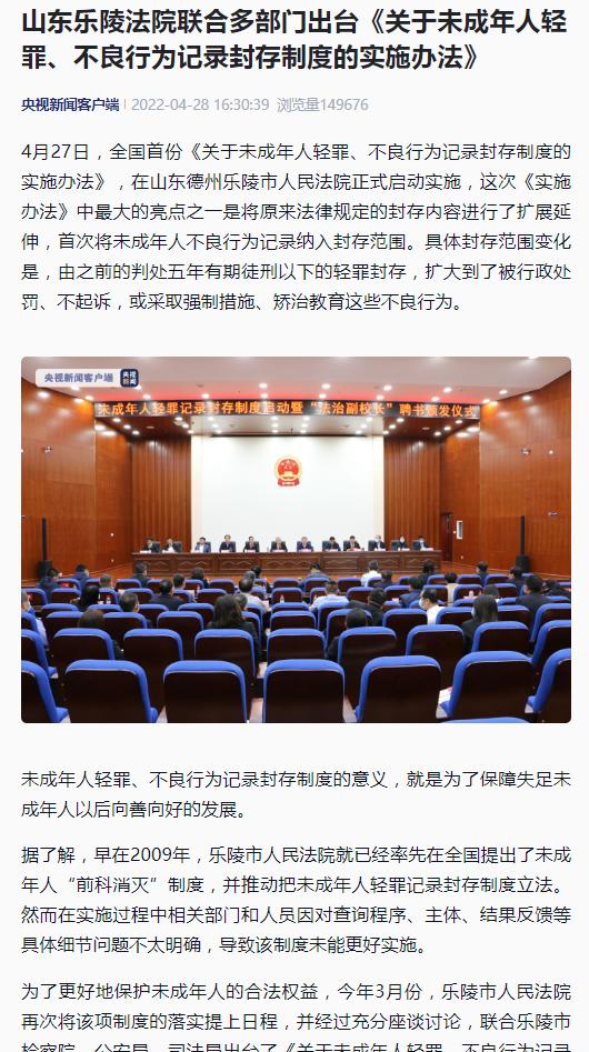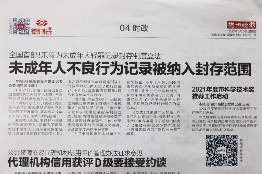 4月27日,乐陵市 “未成年人轻罪、不良行为记录封存”制度启动暨“法治副校长”聘书颁发仪式在乐陵法院举行。乐陵法院联动四部门制定关于未成年人轻罪、不良行为记录封存制度实施办法,及选派20名法官受聘担任法治副校长,在相关学校成立“校园法治工作室”,这一系列工作措施,吸引央视新闻客户端、山东电视台、齐鲁电视台、德州电视台、德州晚报等各大媒体关注报道。