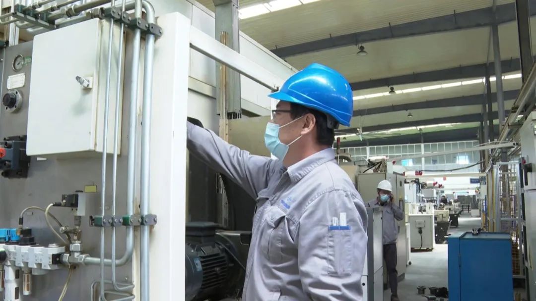 在天润工业技术股份有限公司连杆事业部生产车间,于志强正在维护保养涨断机床。