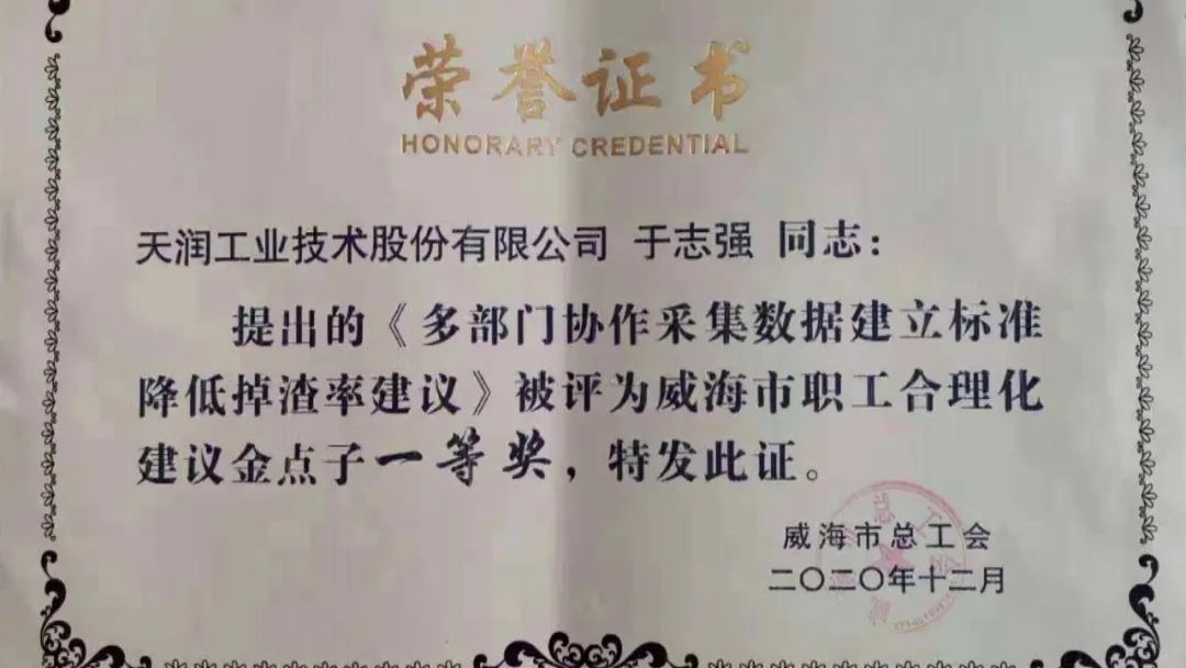 凭借着一项项技术创新成果,于志强连续多年被评为创新标兵,2019年,公司还成立了于志强创新工作室,2021年,被评为文登区首席技师。