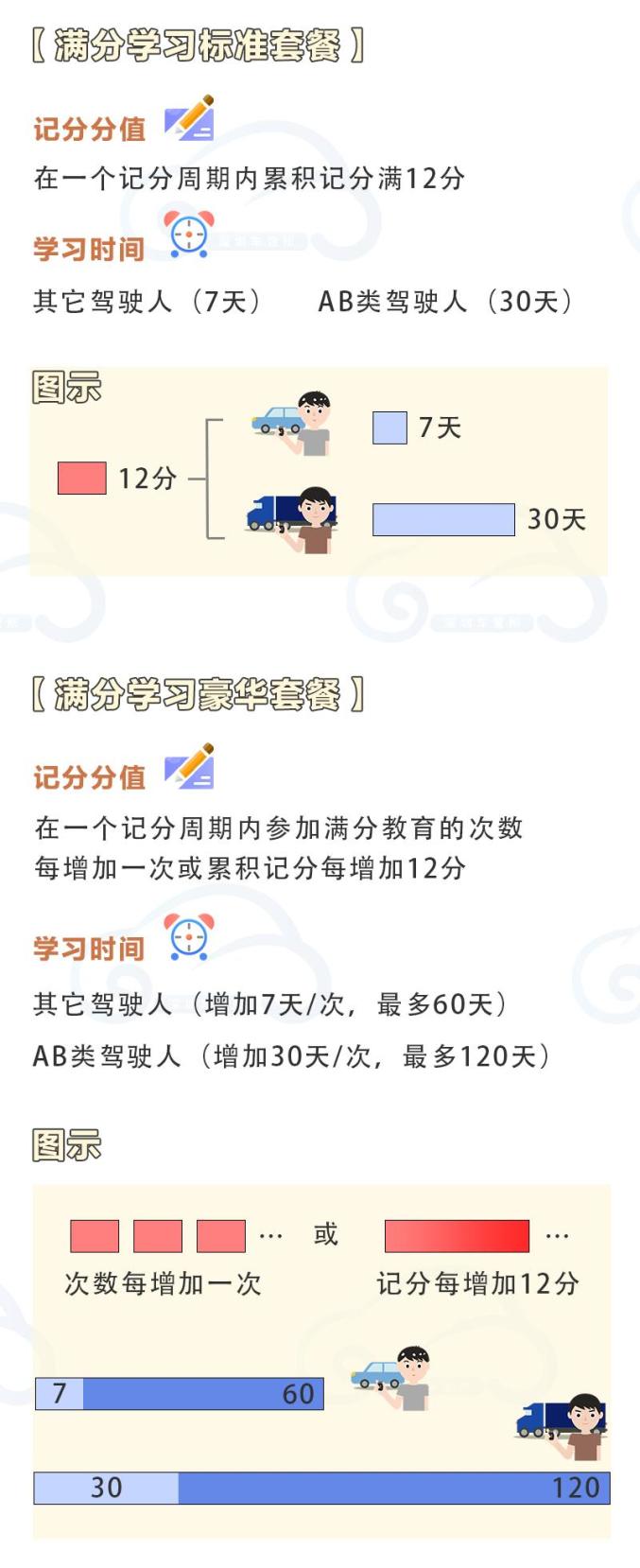 其中,大型客车、重型牵引挂车、城市公交车、中型客车、大型货车驾驶人在一个记分周期内参加满分教育的次数每增加一次或者累积记分每增加12分,道路交通安全法律、法规和相关知识的学习时间增加30天,每次满分学习的天数最多120天。