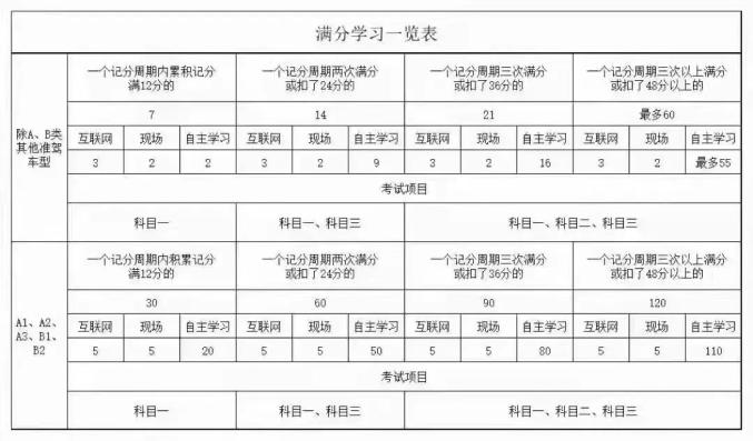 与此同时,机动车驾驶人在一个记分周期内参加满分教育的次数每增加一次或者累积记分每增加12分,道路交通安全法律、法规和相关知识的学习时间增加7天,每次满分学习的天数最多60天。