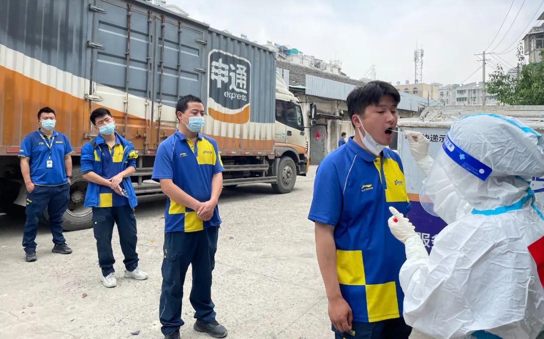 疫情防控工作人员为快递小哥进行核酸检测采样。郝玉佩 全媒体记者 宋炎骏 摄