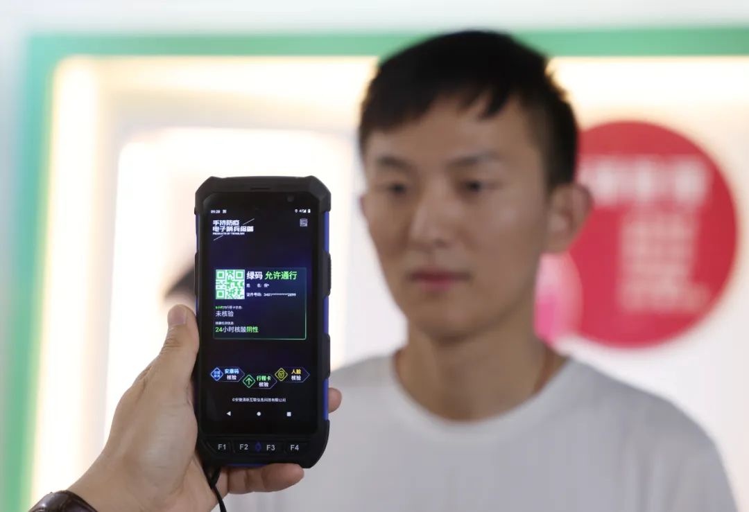 安徽清新互联信息科技有限公司工作人员展示手持防疫“电子哨兵”终端。全媒体记者 宋炎骏 摄