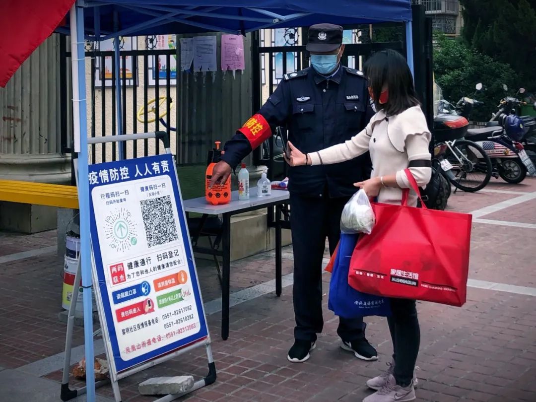 在巢湖市天和小区入口,疫情防控工作人员在检查出入小区居民的“两码”。张钟 摄