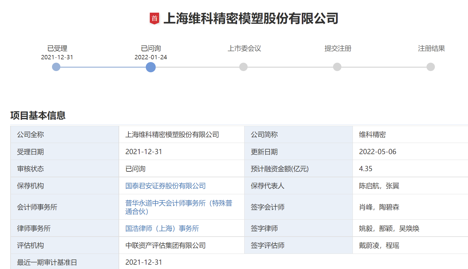 中华网财经5月9日讯 中华网财经了解到,近日,上海维科精密模塑股份有限公司(下称:维科精密)更新招股书,维科精密拟募集资金4.35亿元,拟在深交所创业板上市,国泰君安证券为保荐机构。本次公开发行股票数量不超过3,456.3717万股,占本次发行后总股本的比例不低于25%(不考虑超额配售选择权)。