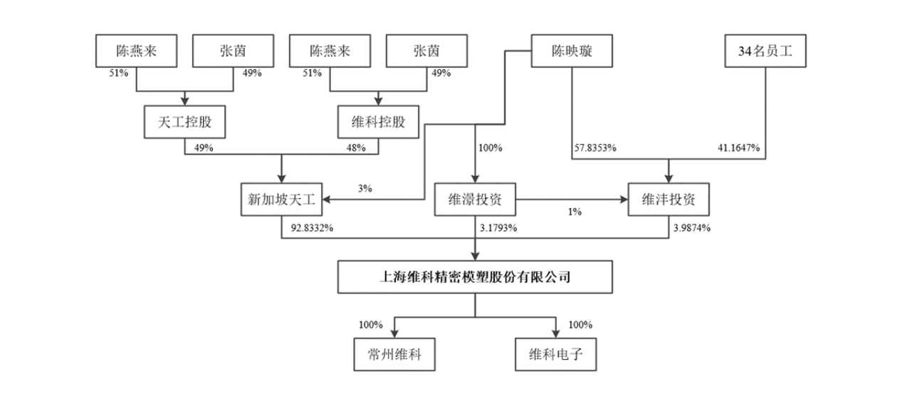 股权结构上,IPO前,公司实际控制人 TAN YAN LAI(陈燕来)、张茵 夫妇通过新加坡天工控制公司 92.83%股份,公司实际控制人女儿通过维沣投资、 维澋投资控制 7.17%股份的表决权,故公司实际控制人 TAN YAN LAI(陈燕来)、 张茵夫妇合计控制公司 100.00%股份的表决权。
