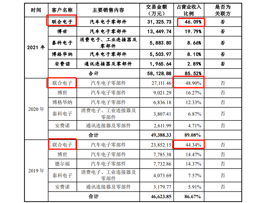 维科精密在招股书中提示了主要客户集中且对单一客户存在依赖的风险,招股书显示公司主要客户为联合电子、博世、博格华纳等汽车零部件一级供应商和泰科电子、安费诺等连接器制造商,均为国内外知名厂商。报告期内,公司对前五大客户的销售收入占比分别为86.67%、89.08%和85.52%,客户集中度较高。报告期内,公司对联合电子的销售收入占比分别为44.34%、48.90%和46.09%,对联合电子存在较大依赖。