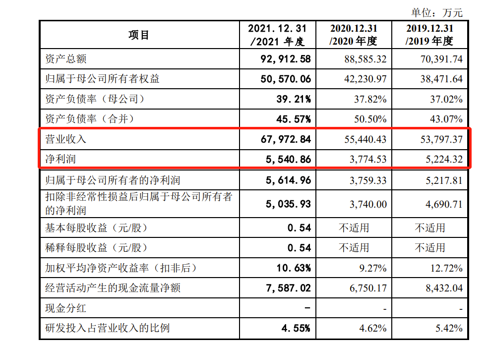 财务数据方面,根据招股书,2019年-2021年(下称:报告期),维科精密实现营收分别为5.38亿元、5.54亿元、6.8亿元,同期净利润分别为5,224.32万元、3,774.53万元、5,540.86万元,扣非后净利润分别为4,690.71万元、3,740万元、5,035.93万元。