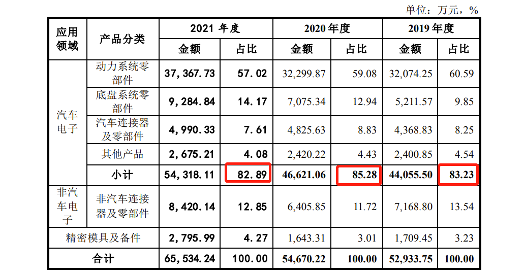 主营业务收入方面,维科精密分为汽车电子、非汽车电子、精密模具及备件三大部分,其中汽车电子为主要收入部分,2019年-2021年占比分别为83.23%、85.28%、82.89%。