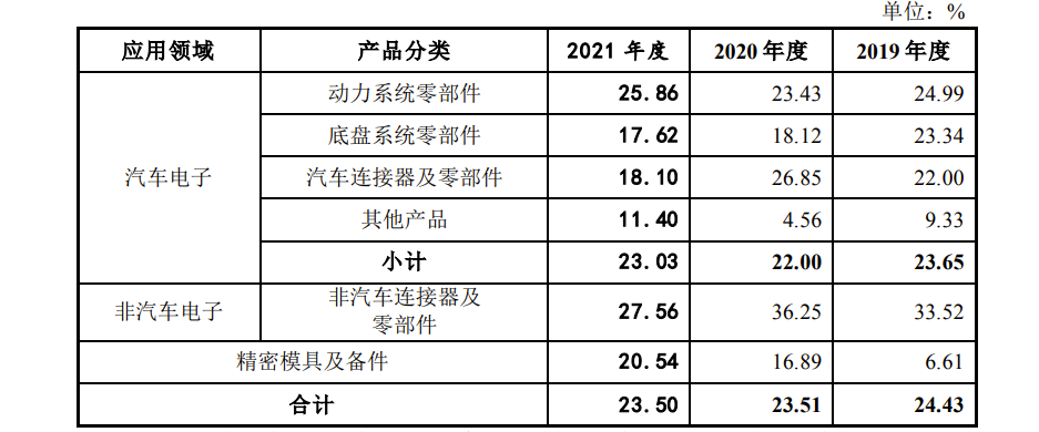 毛利率方面,维科精密主营业务毛利率分别为24.43%、23.51%及23.50%,其中汽车电子产品毛利率分别为23.65%、22.00%及23.03%。其中,非汽车连接器产品毛利率在2021年出现大幅度下跌。
