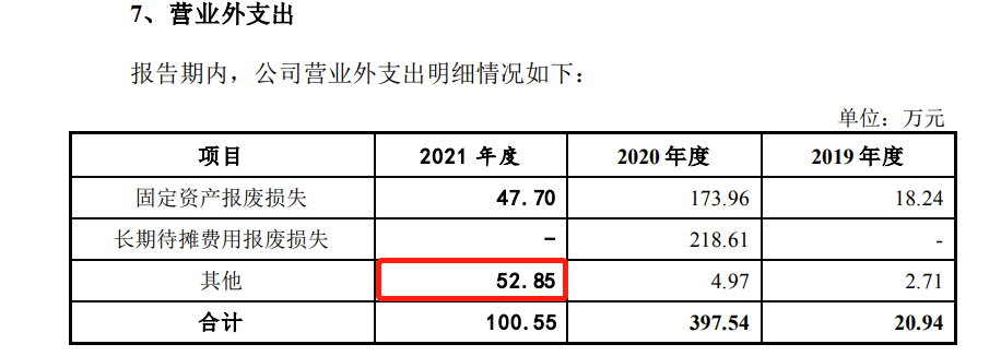 招股书显示,报告期各期内,维科精密营业外支出分别为20.94万元、397.54万元和100.55万元。2021年的营业外支出主要为健康诉讼相关的赔偿费用和固定资产报废损失。