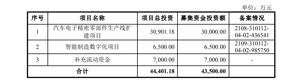 维科精密此次IPO募集资金4.35亿元,用于汽车电子精密零部件生产线扩建项目,募集资金投资额3亿元;智能制造数字化项目,募集资金投资额6500万元;补充流动资金,募集资金投资额7000万元。