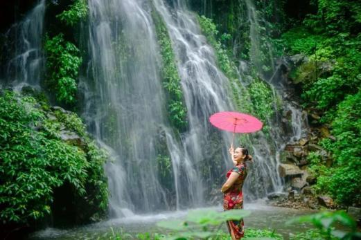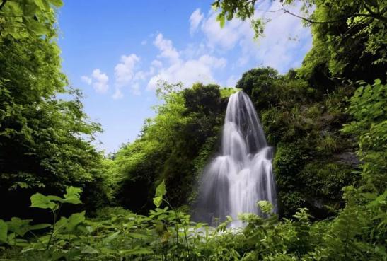 “六十丈洞瀑布”水流飞跌飘洒,遮天蔽日
