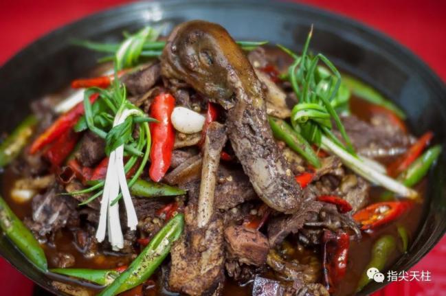血浆鸭是天柱的一道传统菜肴,天柱的土鸭淋入适量的鸭血浆,配料佐以生姜、大蒜、三赖等,用鸭血其烹调鸭肉,不仅营养丰富,还可将煮入味的鸭肉汤汁及调味料粘附和包裹上煮熟的鸭肉块上,吃起来香麻、爽口。
