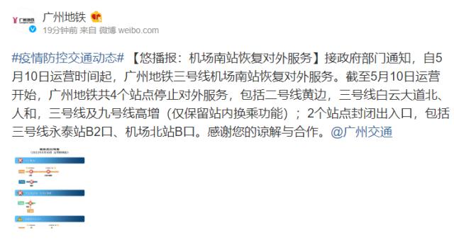 接政府部门通知,自5月10日运营时间起,广州地铁三号线机场南站恢复对外服务。