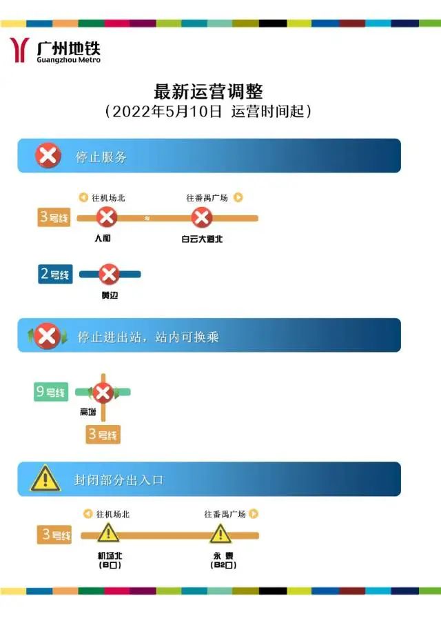 包括:二号线黄边,三号线白云大道北、人和,三号线及九号线高增(仅保留站内换乘功能);2个站点封闭出入口,包括三号线永泰站B2口、机场北站B口。