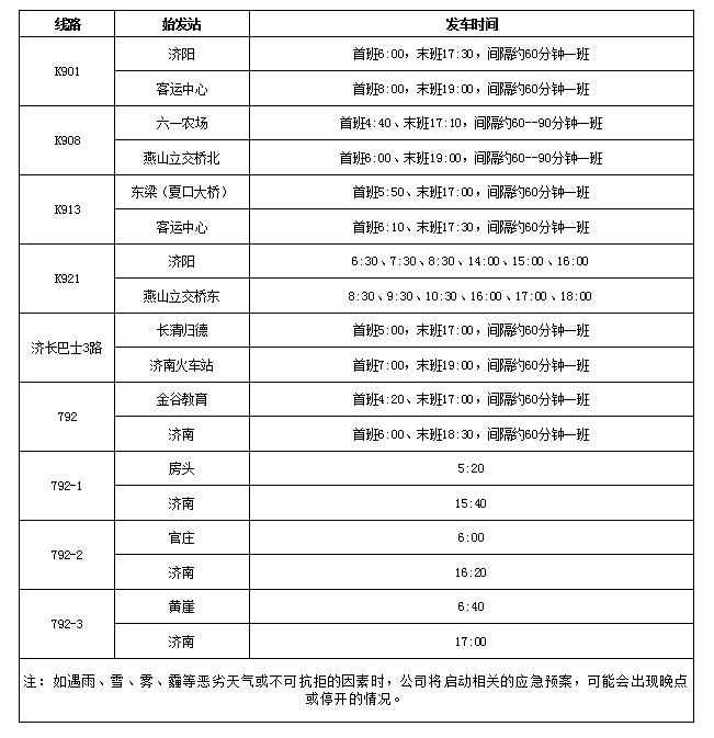 区际公交线路以及长清城区城乡公交线路,具体发车时间详询96369。