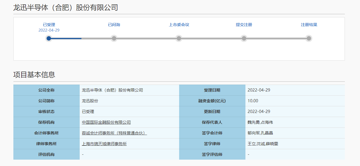 中华网财经5月10日讯 中华网财经了解到,日前,龙迅半导体(合肥)股份有限公司(以下简称“龙迅股份”)冲刺科创板IPO获上交所受理,中金公司为保荐机构。早在2020年10月底,龙迅股份就曾申请科创板IPO,拟募资3.15亿元,此后于2021年1月撤回发行上市申请。此次,龙迅股份计划募集资金总额不超过9.58亿元,募资金额较上次翻了逾3倍。