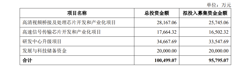 招股书显示,龙迅股份计划募集资金9.58亿元,从募投项目来看,龙迅股份计划使用募集资金投入到高清视频信号处理与控制芯片开发和产业化项目、高速信号传输芯片开发和产业化项目及研发中心升级项目。最新申报稿中,加大了对上述三大募投项目的投资力度,分别计划投入募集资金2.57亿元、1.65亿元、3.35亿元,还增加了“发展与科技储备资金”作为新的募投项目,投入金额为2亿元。