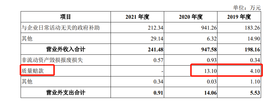 另外招股书披露,报告期内,龙迅股份营业外支出分别为 5.53 万元、14.06 万元和 0.91 万元,主要为公司支付的质量赔款。其中,2019-2020年质量赔款分别为4.1万元、13.1万元,总计17.2万元。