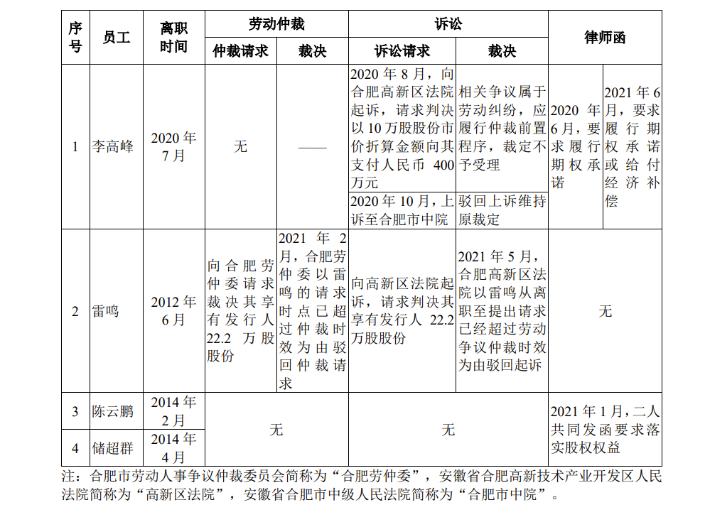 中华网财经查阅招股书发现,员工李高峰2020年7月离职,2020年8月,向合肥高新区法院起诉,请求判决以10万股股份市价折算金额向其支付人民币400万元,被裁定不予受理。2020年10月,上诉至合肥市中院被驳回上诉维持原裁定。2020年6月及2021年6月,两次律师函要求履行期权承诺或给付经济补偿。