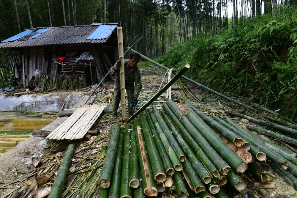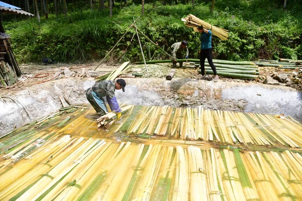 断筒。将嫩竹断成两米长剖成3厘米左右宽的栅子,捆束成把。陈伟凯 摄
