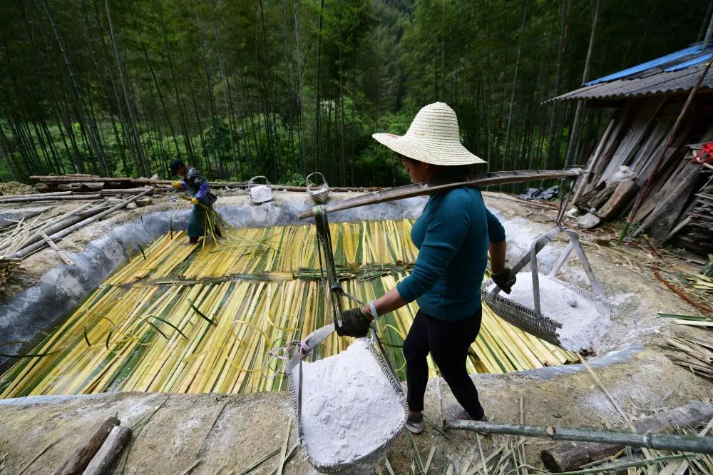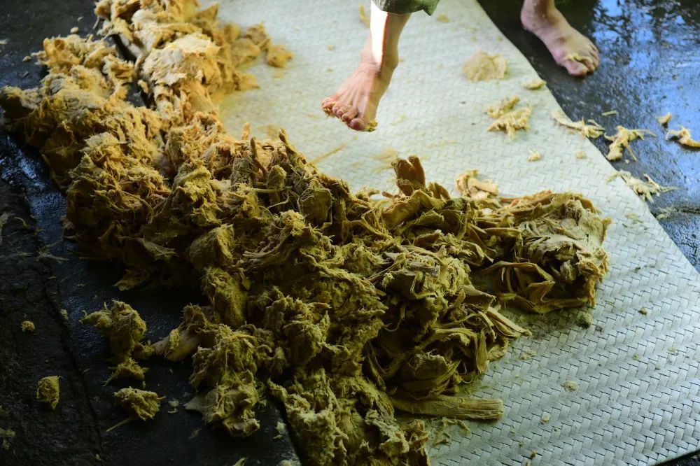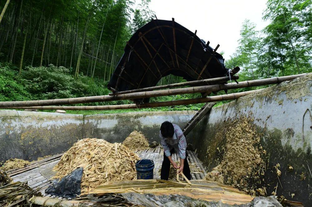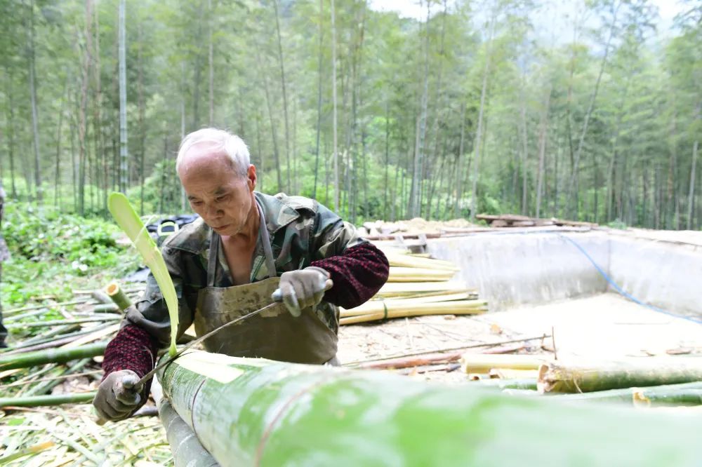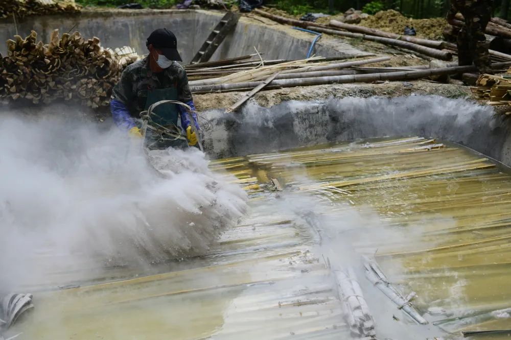 剥竹麻。取出竹料洗净,再放进湖塘,引来泉水漂洗。接着将竹料剥去竹节和内外两层皮,放入竹料槽内。陈伟凯 摄