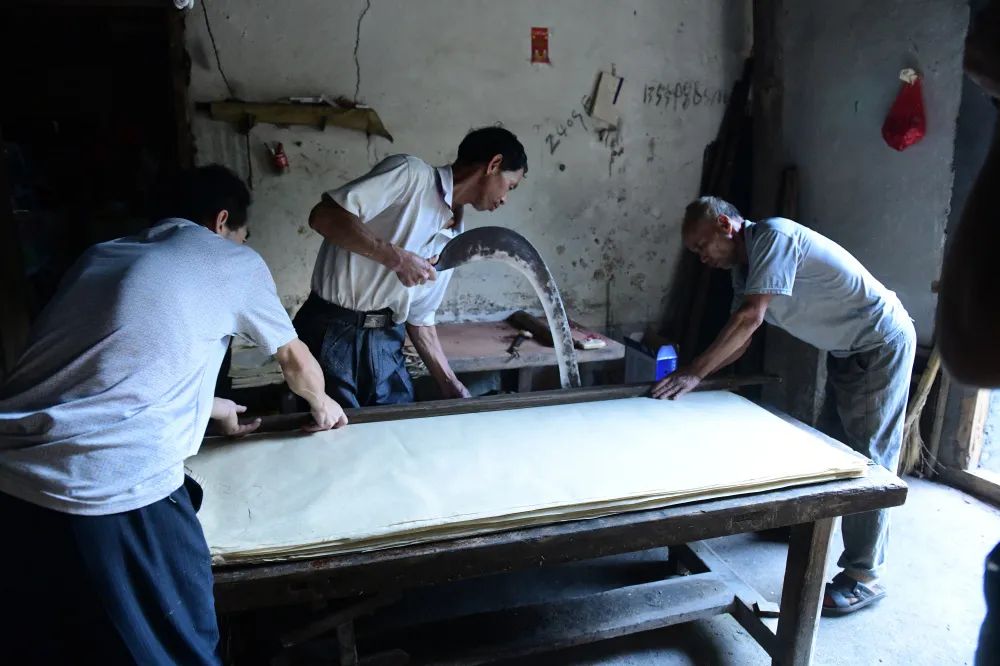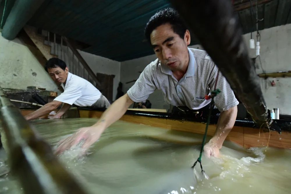 耘槽。纸工们配合协调,手持一块抄纸帘放进纸槽,荡料入帘。陈伟凯 摄