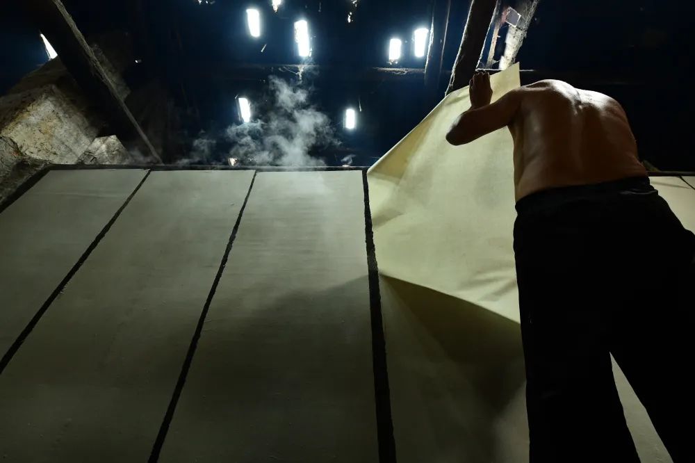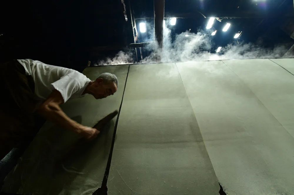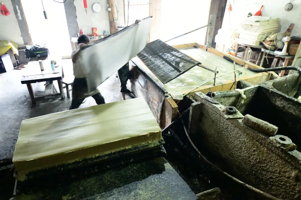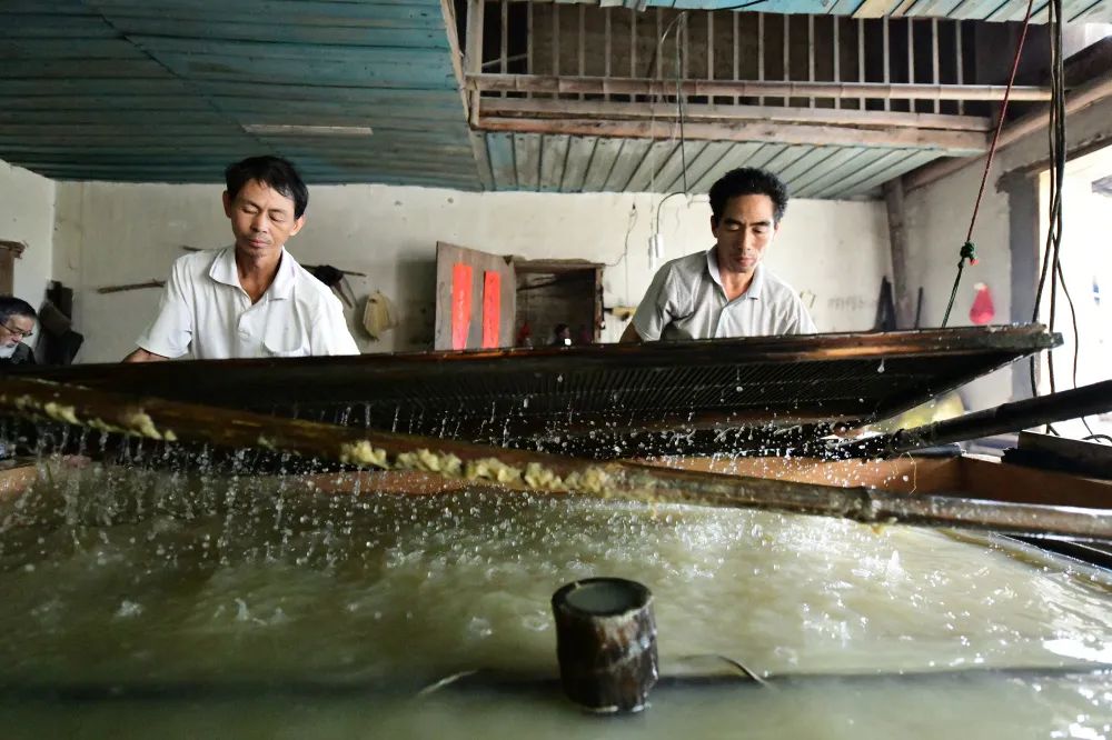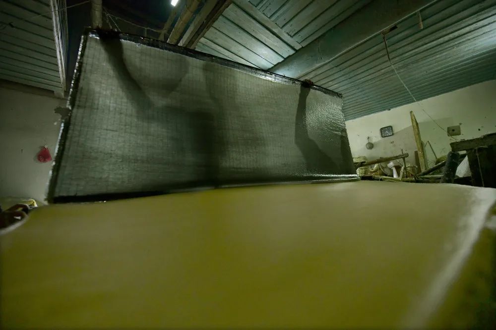 将帘子提起,滤去水,只留下一层薄薄的纸浆。陈伟凯 摄