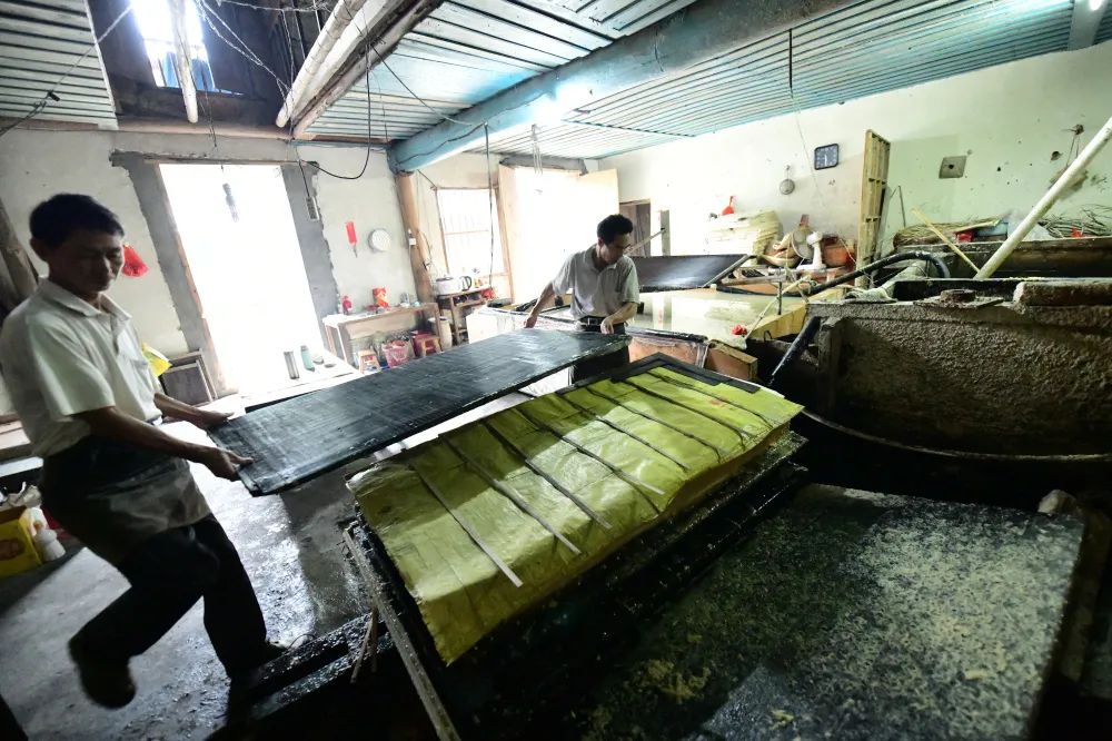 将一张张湿纸厚厚叠在粗重的纸榨上,榨去水分。陈伟凯 摄