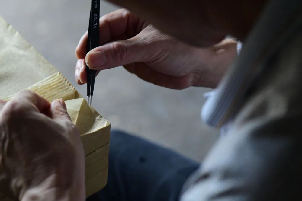 抄纸。用钳子从纸头处将粘连在一起的湿纸一张张钳开。陈伟凯 摄